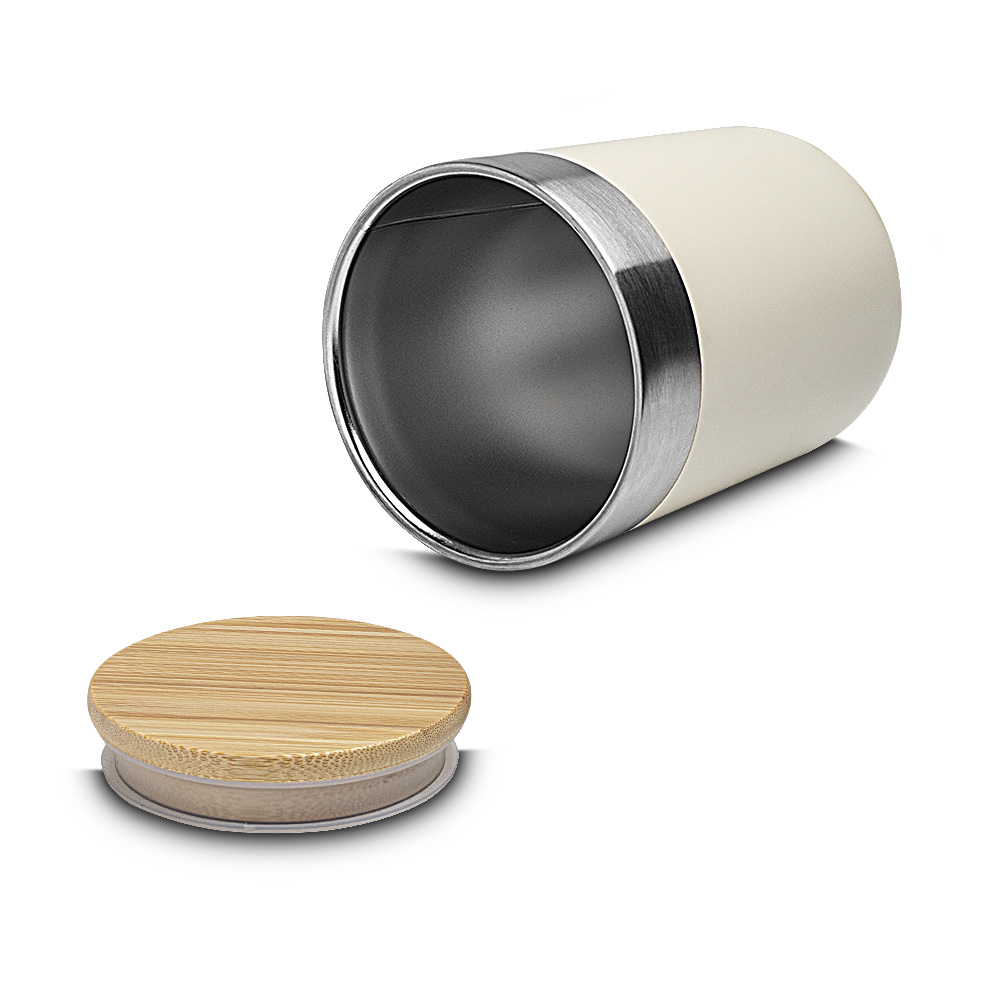 Copo térmico em aço inox, capacidade de 300mL, com pintura fosca, detalhe em aço inox, tampa em bambu com anel de silicone para vedação.