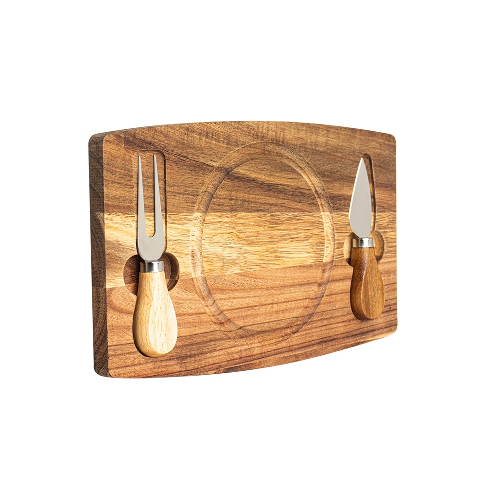Kit queijo 3 peças, com tábua de madeira com canaleta, faca com ponta e garfo, em madeira e inox. Tábua com imã para encaixe e fixação dos utensílios.