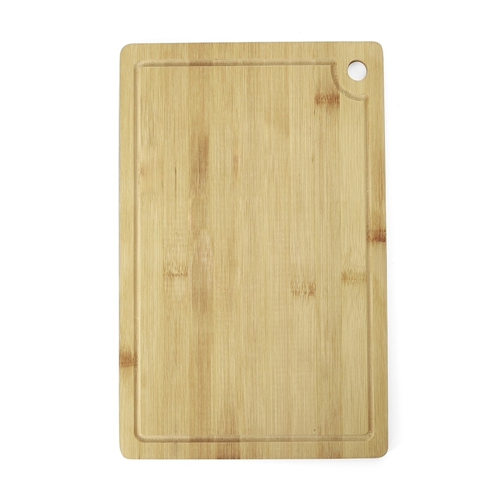 Tábua de corte retangular em bambu com canaleta e acesso para gancho.